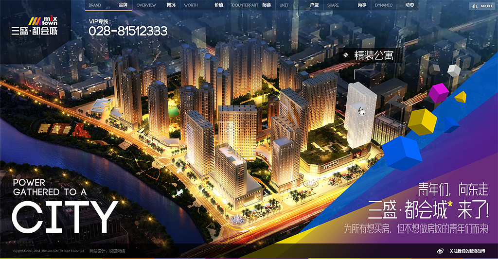 基于房产网站的特有性质,锐狐网络通过前期的需求调研、规划,全面实现了三盛·都会城网站品牌定位、视觉传达和网络品牌推广应用。